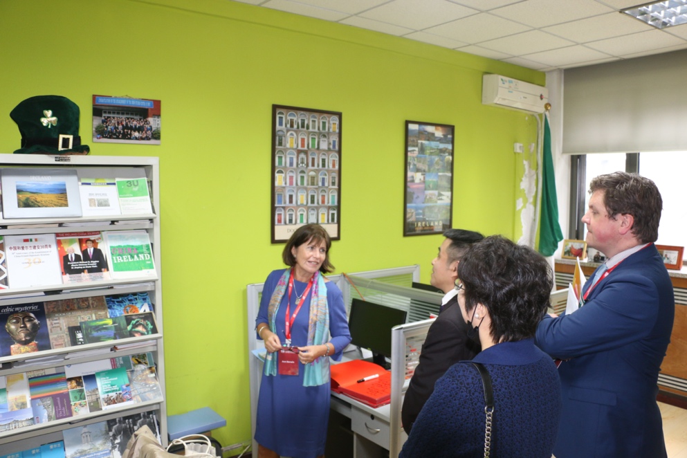 近日,爱尔兰驻华大使安黛文(Ann Derwin)、爱尔兰外交贸易部一等秘书欧恩·麦克唐纳(Eoin McDonnell)一行在参加北京外国语大学80周年校庆活动后,访问了pg国际电子网站爱尔兰研究中心。
