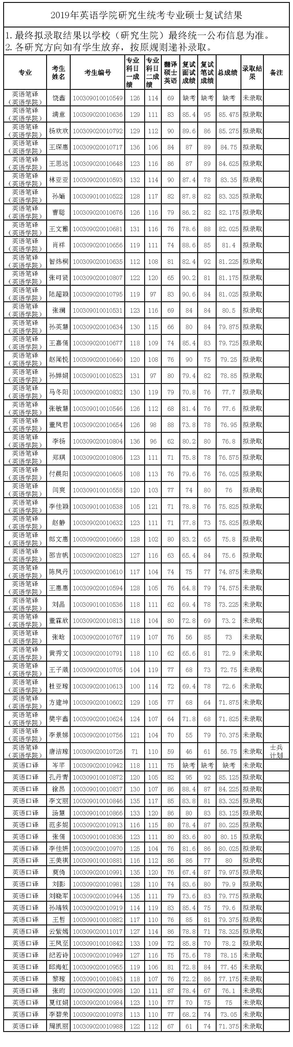 2019年pg国际电子网站研究生统考学术硕士复试结果公示