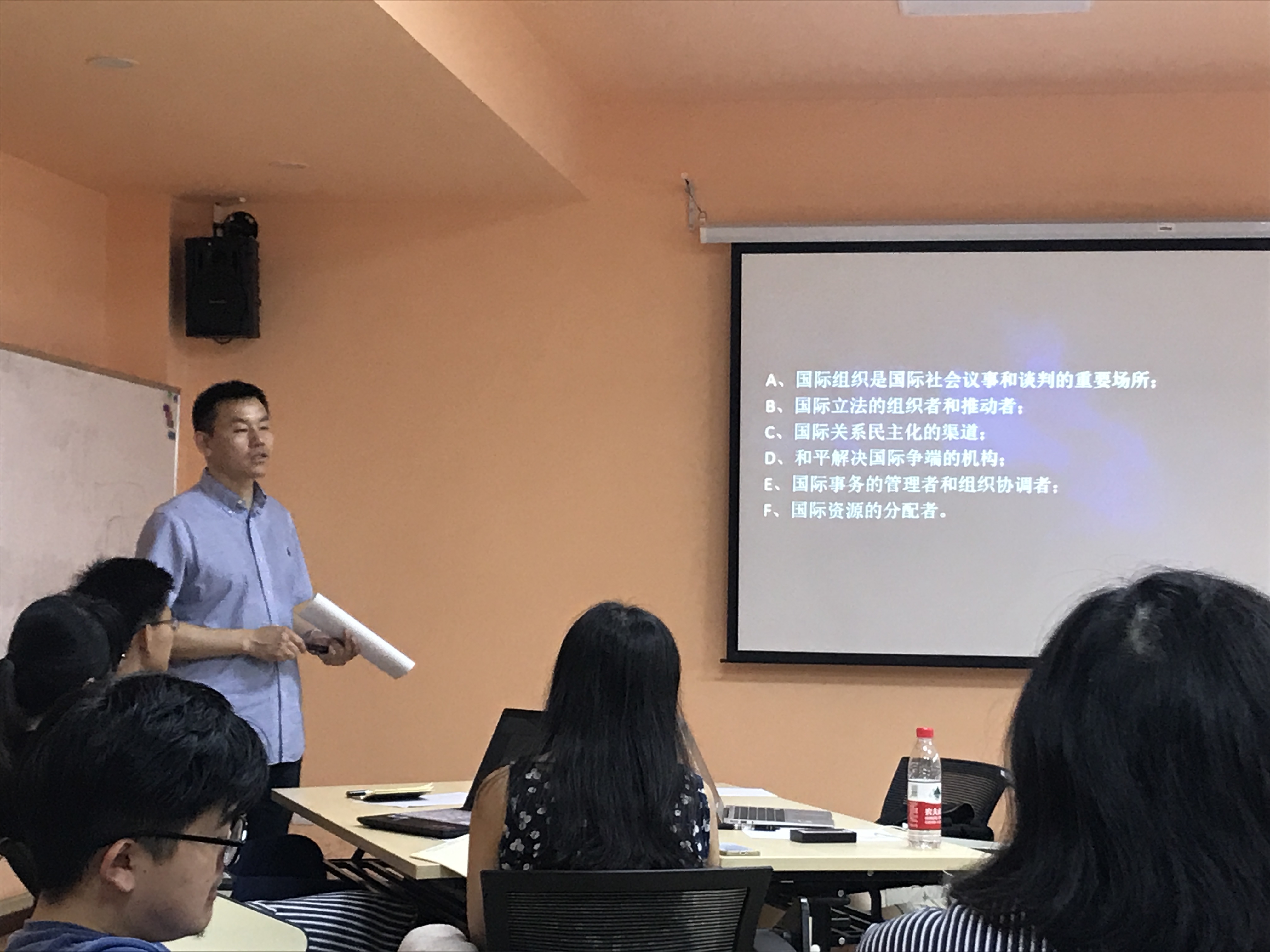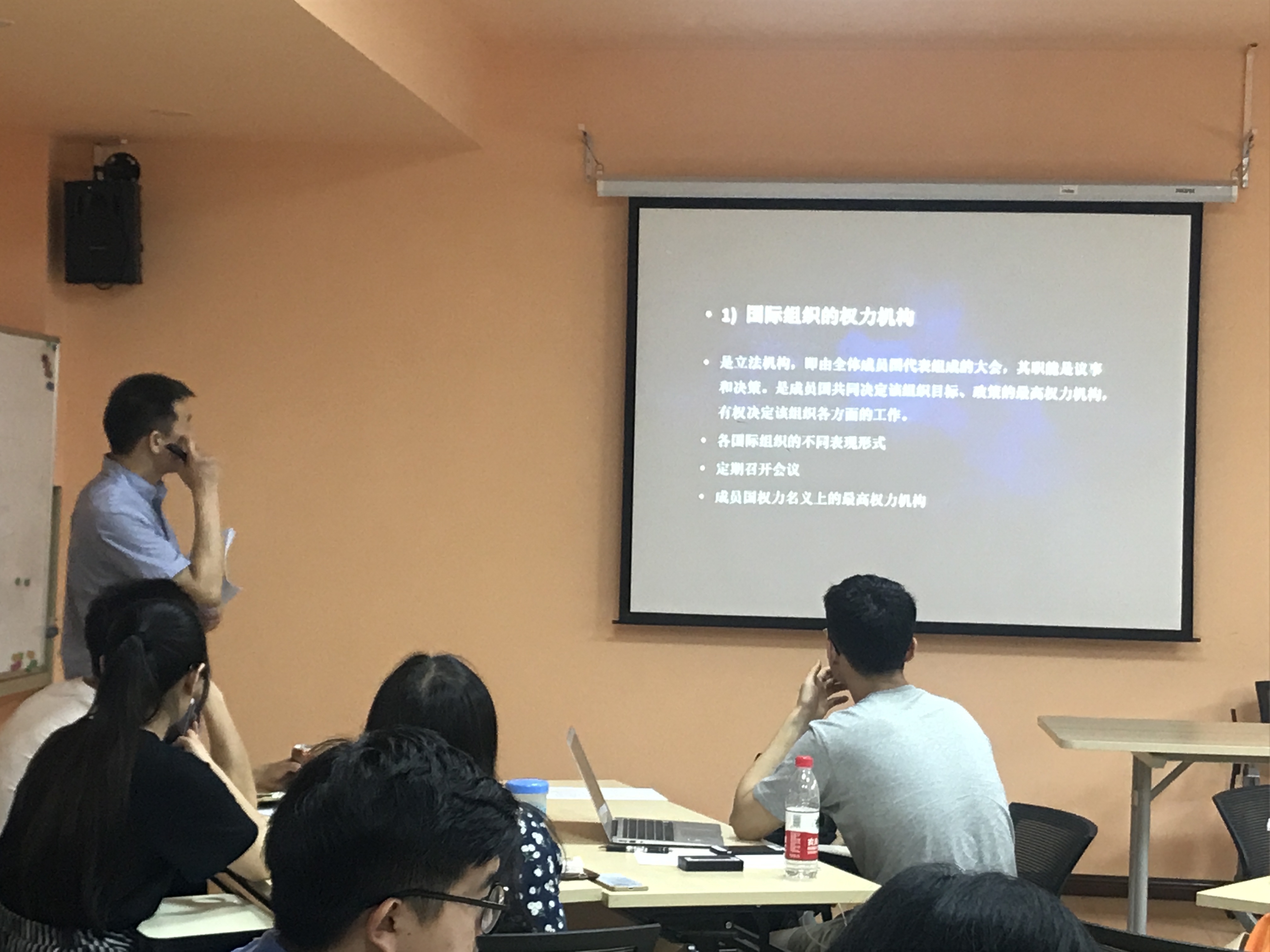 ——在课堂上,张教授首先将国际组织同主权国家进行了比较,指出国际组织具有无领土居民、非主权性、非强制性的特点。通过列举联合国决议、播放教学视频、与同学们讨论当下时政热点等方式,他向同学们解释了政府间与非政府国际组织、全球性与地区间国际组织、国际公务员等概念。接下来,从联合国、欧盟、亚投行、博鳌论坛等案例出发,同学们一起深入分析了国际组织的运作方式,以及其在当今国际事务中扮演的重要作用。课程随后着眼于中国同国际组织的关系变迁,张教授指出,如今在国际组织,中国虽然已经有了一定的影响力和话语权,但还是存在着中国籍国际公务员人数少、人才培养机制有待完善等不足之处。最后,本期课程的助教、来自高级翻译学院2016级MTI的徐雪惠结合自己在联合国新闻处的实习经历,为同学们简要介绍了联合国实习机会的申请方式和竞聘流程,强调了突出的个人素质和扎实的业务功底在实习申请中的重要性。通过本次课,同学们掌握了国际组织的基本情况,明确了中国在国际组织的地位和作用。